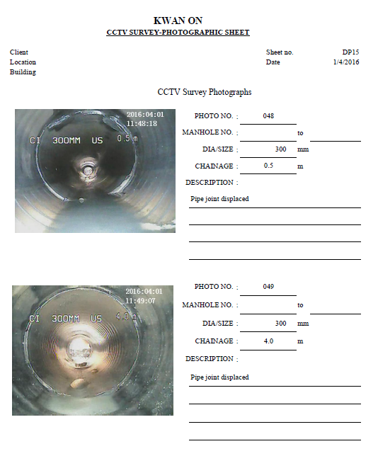 污水渠、雨水渠、地盤渠廁所、廚房等渠道內CCTV檢查,有助新渠驗收及找出渠內堵塞和渠下陷損壞情況,編寫報告交業主。