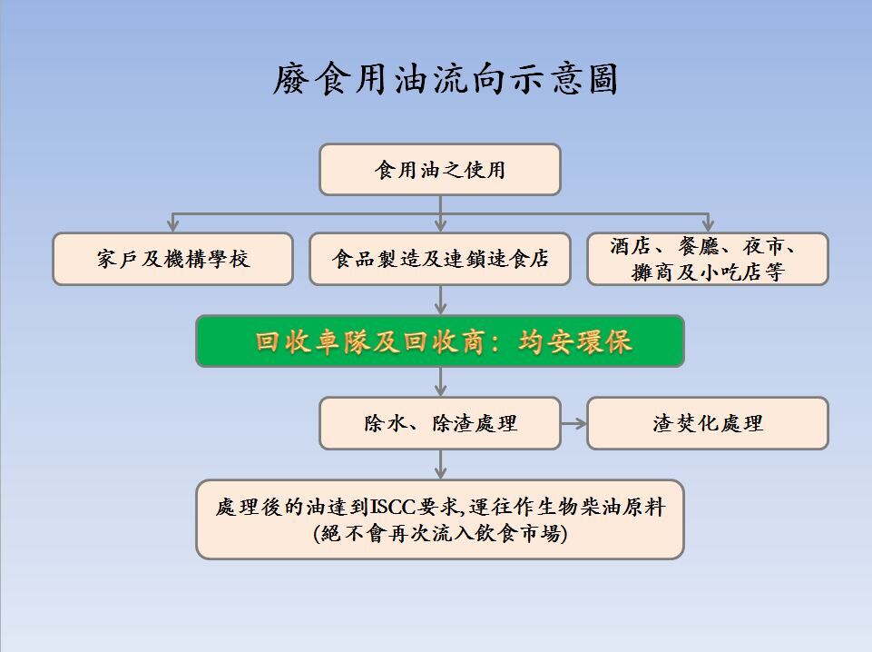 廢食油是製造生物燃油的最佳原料,我們回收的廢食油經過在工廠進行脫水除雜后運往歐洲作生物柴油的原材料,絕對不會回用到飲食市場。廢食油回收受IS CC認證監管,多年來一直是美資快餐店及各大酒店食肆的指定回收商。